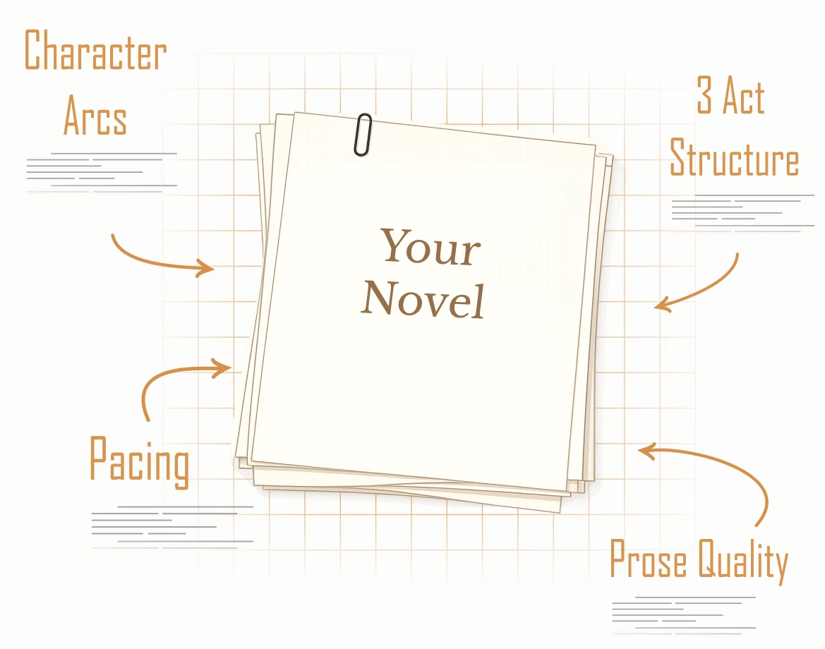 Upload your manuscript and receive a structured diagnostic report across structure, pacing, prose, emotion, setting, and character.